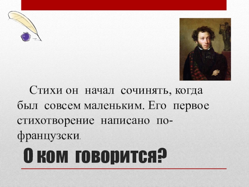 О ком говорится?  Стихи он начал сочинять, когда был совсем маленьким. Его первое стихотворение написано по-французски.