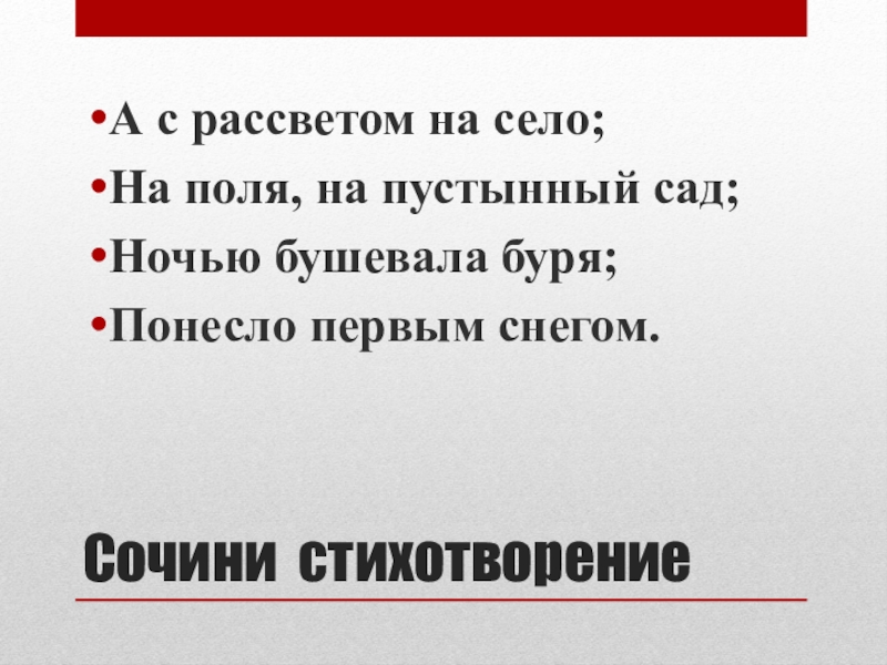 Сочини стихотворение А с рассветом на село; На поля, на пустынный сад; Ночью бушевала буря; Понесло первым