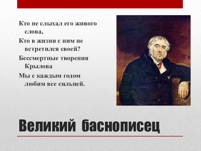 Великий баснописецКто не слыхал его живого слова,Кто в жизни с ним не встретился своей?Бессмертные творения КрыловаМы с