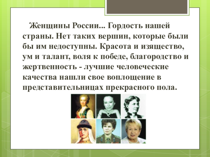 Слайд 2 Женщины России... Гордость нашей страны. Нет таких вершин, которые