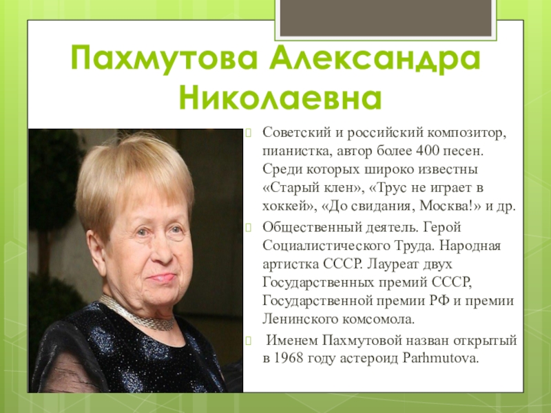 Пахмутова Александра  НиколаевнаСоветский и российский композитор, пианистка, автор более 400 песен. Среди которых широко известны «Старый