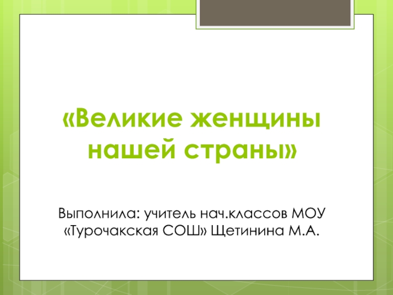 «Великие женщины нашей страны»Выполнила: учитель нач.классов МОУ «Турочакская СОШ» Щетинина М.А.
