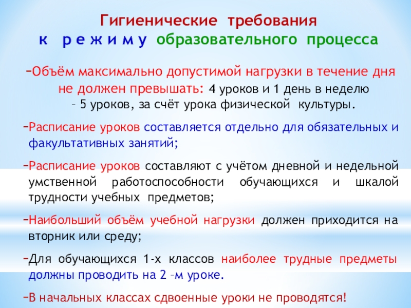 Объём максимально допустимой нагрузки в течение дня не должен превышать: 4 уроков и 1 день в неделю – 5 уроков, за счёт урока физической культуры.