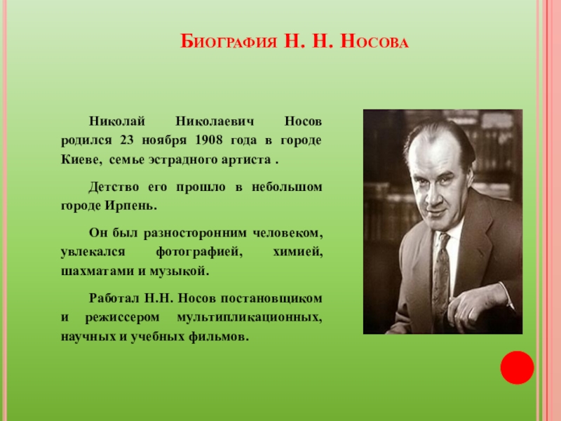 Биография Н. Н. Носова Николай Николаевич Носов родился 23 ноября 1908 года в городе Киеве, семье эстрадного артиста . Детство его прошло в небольшом городе Ирпень. Он был