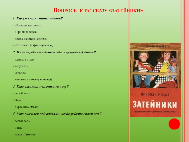 Вопросы к рассказу «затейники»1. Какую сказку читали дети?- «Красная шапочка»- «Три поросенка»- «Волк и семеро козлят»- «Теремок»