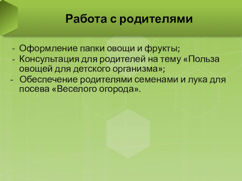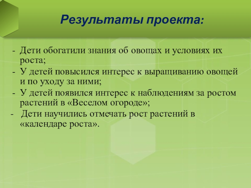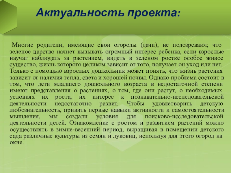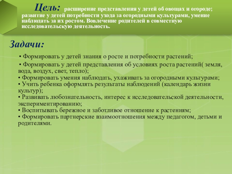 Цель: расширение представления у детей об овощах и огороде; развитие у детей потребности ухода за огородными культурами, умение наблюдать за их ростом. Вовлечение родителей в совместную исследовательскую деятельность.
