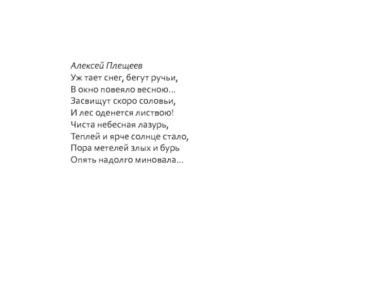 Алексей ПлещеевУж тает снег, бегут ручьи, В окно повеяло весною… Засвищут скоро соловьи, И лес оденется листвою!