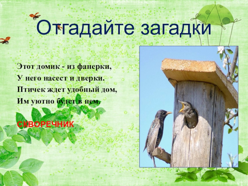 Отгадайте загадки Этот домик - из фанерки,У него насест и дверки.Птичек ждет удобный дом,Им уютно будет