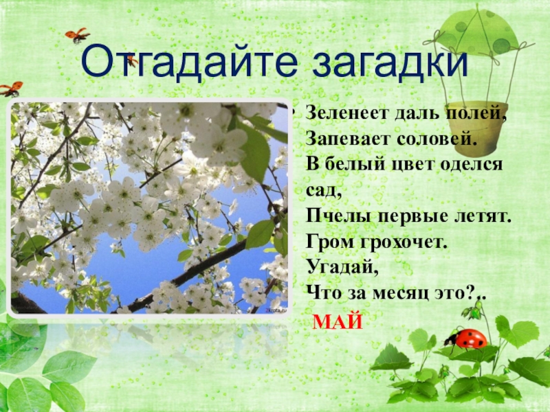 Отгадайте загадки Зеленеет даль полей, Запевает соловей. В белый цвет оделся сад, Пчелы первые летят. Гром
