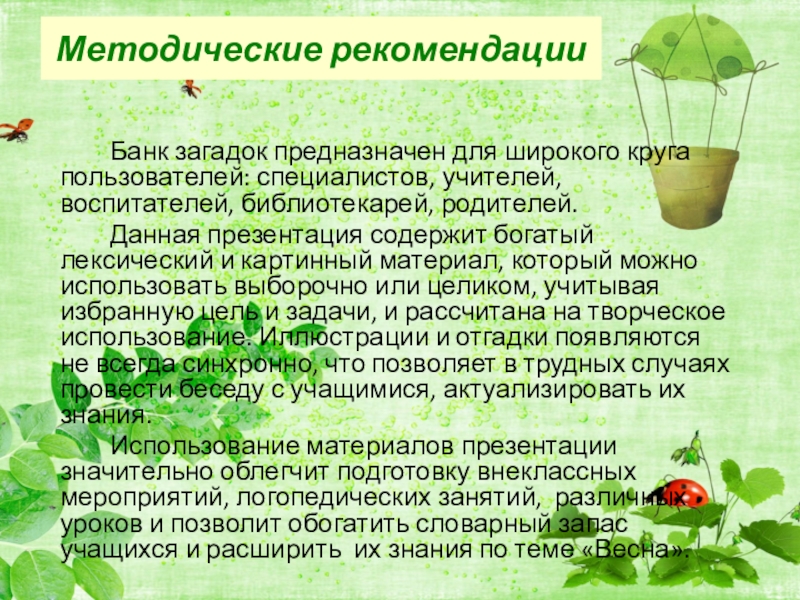 Методические рекомендации Банк загадок предназначен для широкого круга пользователей: специалистов, учителей, воспитателей, библиотекарей, родителей. Данная презентация содержит богатый лексический и картинный материал, который можно использовать выборочно или целиком, учитывая избранную цель и задачи, и рассчитана на творческое