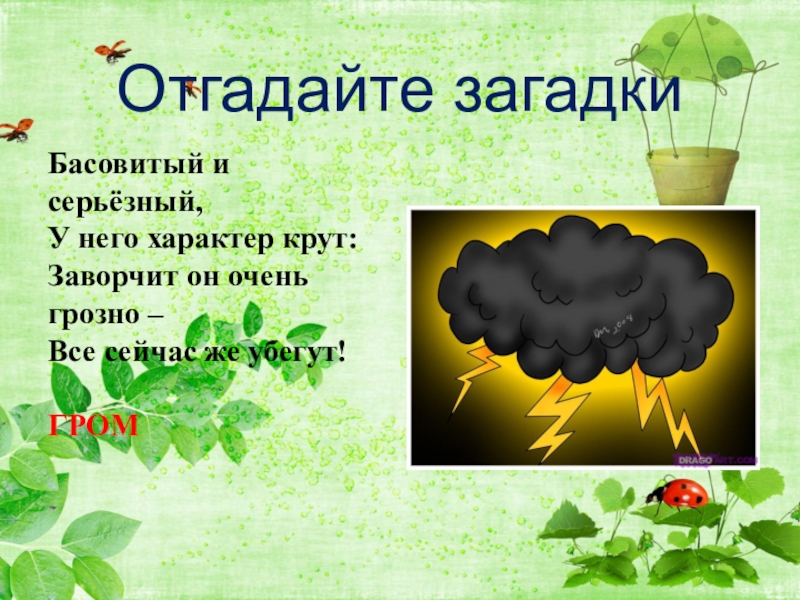 Отгадайте загадки Басовитый и серьёзный,У него характер крут:Заворчит он очень грозно –Все сейчас же убегут!ГРОМ