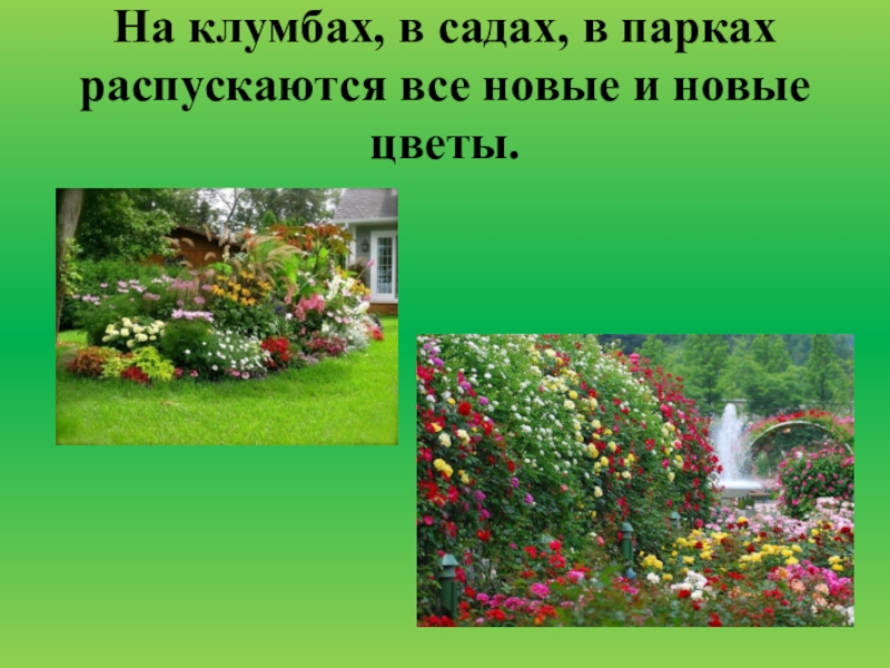 Слайд 22На клумбах, в садах, в парках распускаются все новые и новые