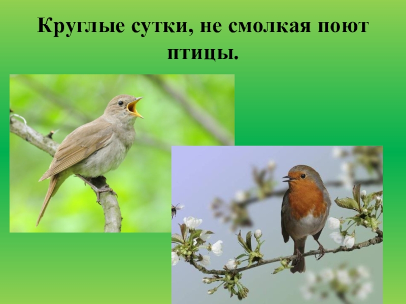 Слайд 18Круглые сутки, не смолкая поют птицы.