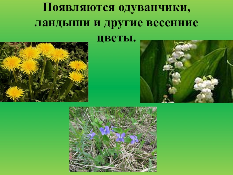 Слайд 20Появляются одуванчики, ландыши и другие весенние цветы.