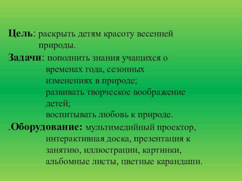 Цель: раскрыть детям красоту весенней       природы.Задачи: пополнить знания учащихся о