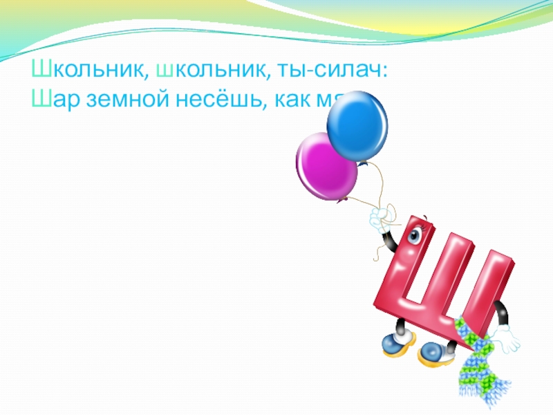 Слайд 25Школьник, школьник, ты-силач: Шар земной несёшь, как мяч