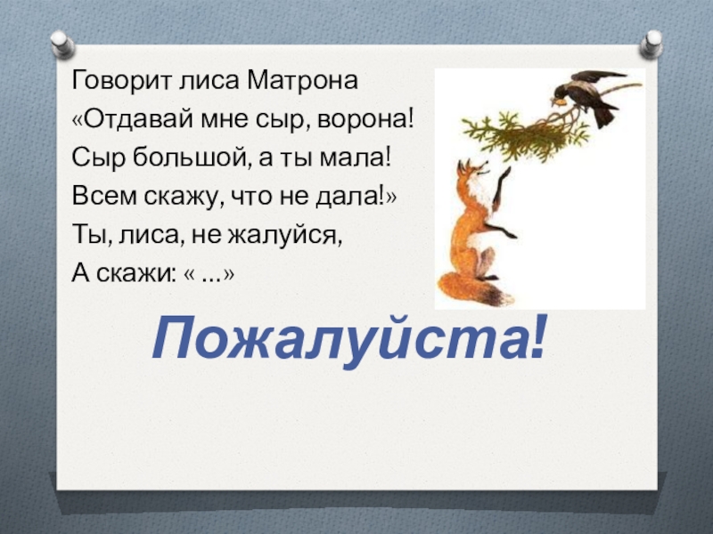 Говорит лиса Матрона«Отдавай мне сыр, ворона!Сыр большой, а ты мала!Всем скажу, что не дала!»Ты, лиса, не жалуйся,А