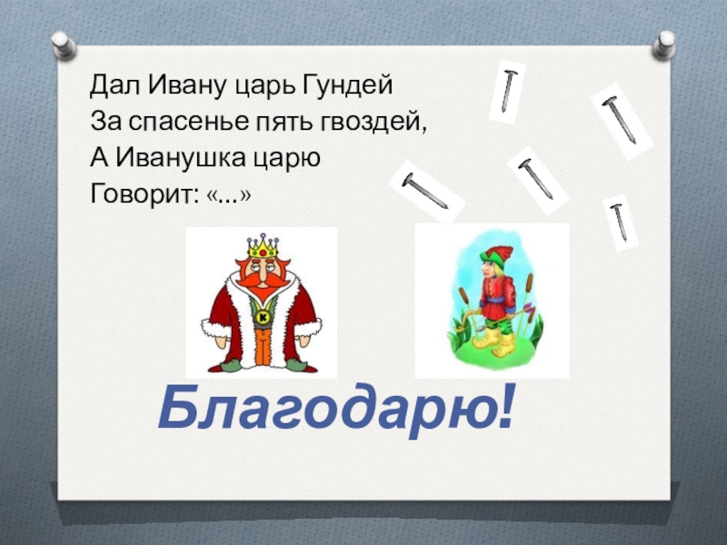 Дал Ивану царь ГундейЗа спасенье пять гвоздей,А Иванушка царюГоворит: «…»Благодарю!