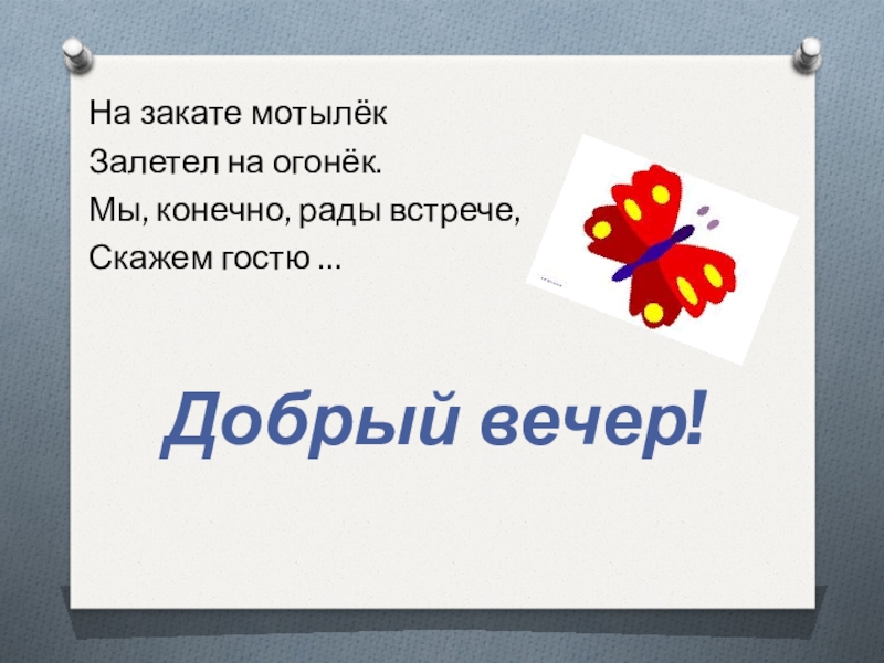 На закате мотылёкЗалетел на огонёк.Мы, конечно, рады встрече,Скажем гостю …Добрый вечер!