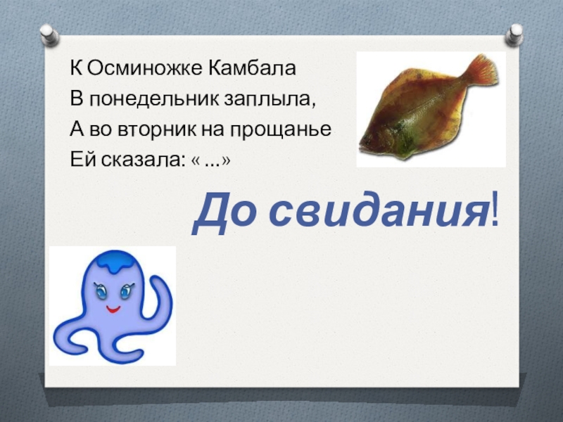 К Осминожке КамбалаВ понедельник заплыла,А во вторник на прощаньеЕй сказала: « …»До свидания!