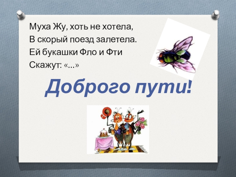 Муха Жу, хоть не хотела,В скорый поезд залетела.Ей букашки Фло и ФтиСкажут: «…»Доброго пути!