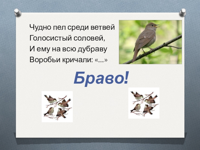 Чудно пел среди ветвейГолосистый соловей,И ему на всю дубравуВоробьи кричали: «…»Браво!