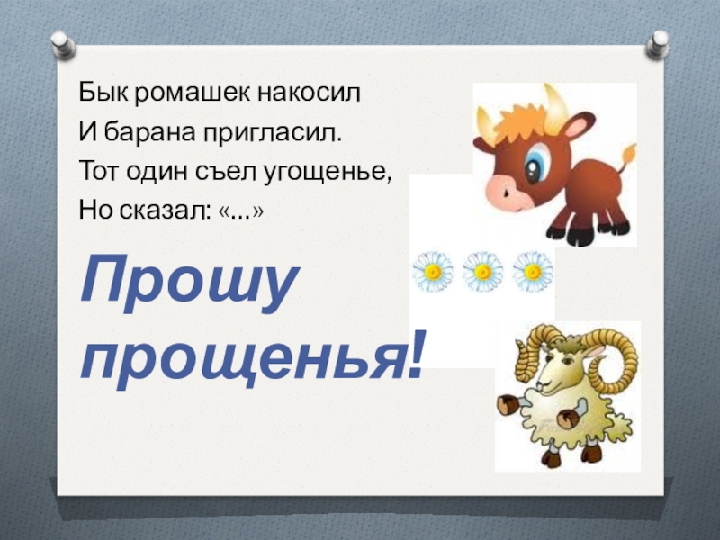 Бык ромашек накосилИ барана пригласил.Тот один съел угощенье,Но сказал: «…»Прошу прощенья!