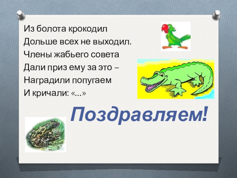 Из болота крокодилДольше всех не выходил.Члены жабьего советаДали приз ему за это –Наградили попугаемИ кричали: «…»Поздравляем!
