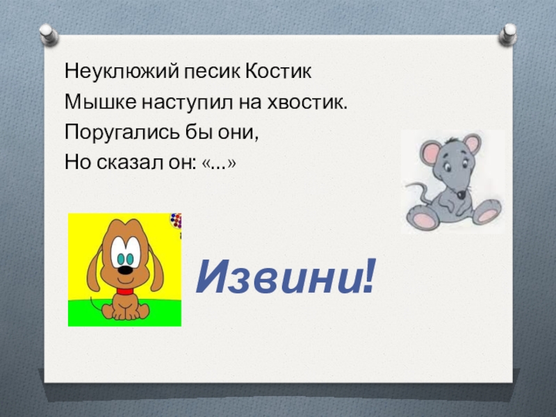 Неуклюжий песик КостикМышке наступил на хвостик.Поругались бы они,Но сказал он: «…»Извини!