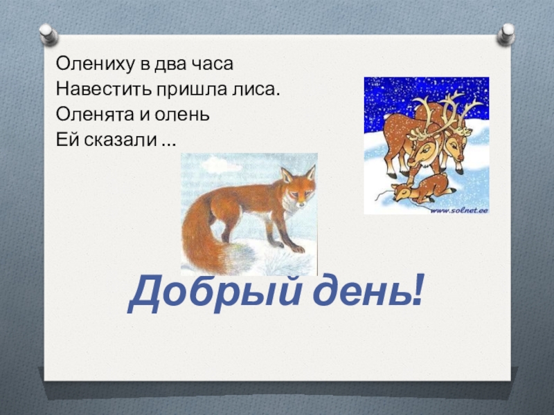Олениху в два часаНавестить пришла лиса.Оленята и оленьЕй сказали …Добрый день!