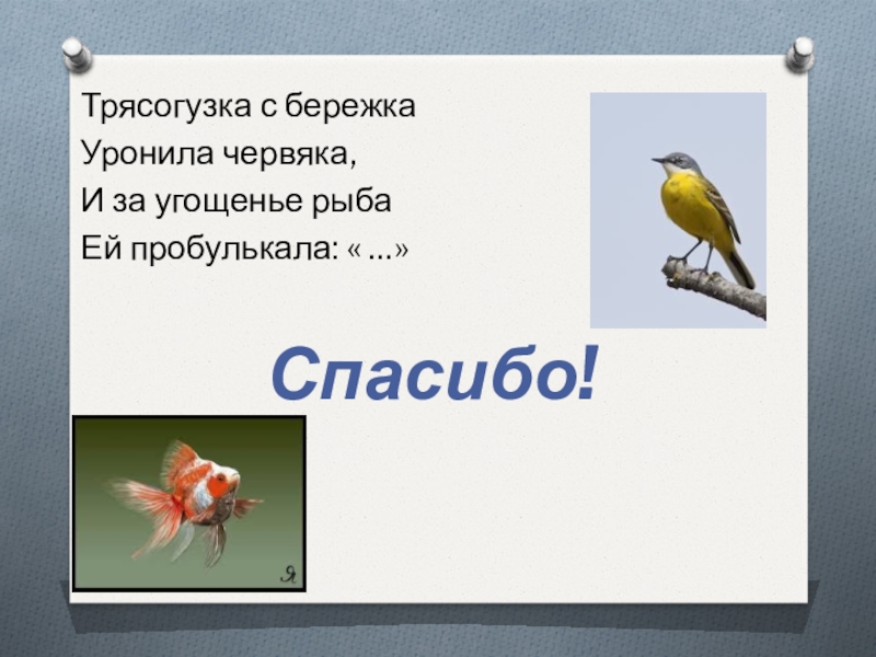 Трясогузка с бережкаУронила червяка,И за угощенье рыбаЕй пробулькала: « …»Спасибо!