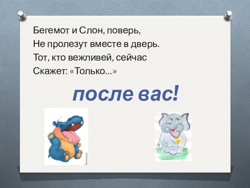 Бегемот и Слон, поверь,Не пролезут вместе в дверь.Тот, кто вежливей, сейчасСкажет: «Только…»после вас!