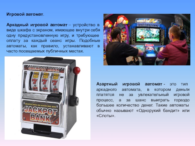 Азартный игровой автомат - это тип аркадного автомата, в котором деньги платятся не за увлекательный игровой процесс, а за шанс выиграть гораздо большее количество денег. Такие автоматы обычно называют «Однорукий бандит» или «Слоты».