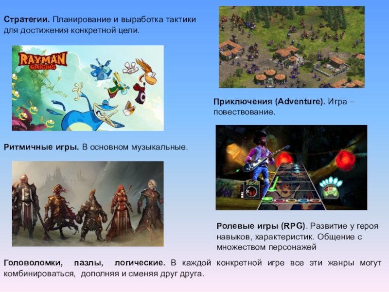 Головоломки, пазлы, логические. В каждой конкретной игре все эти жанры могут комбинироваться, дополняя и сменяя друг друга.