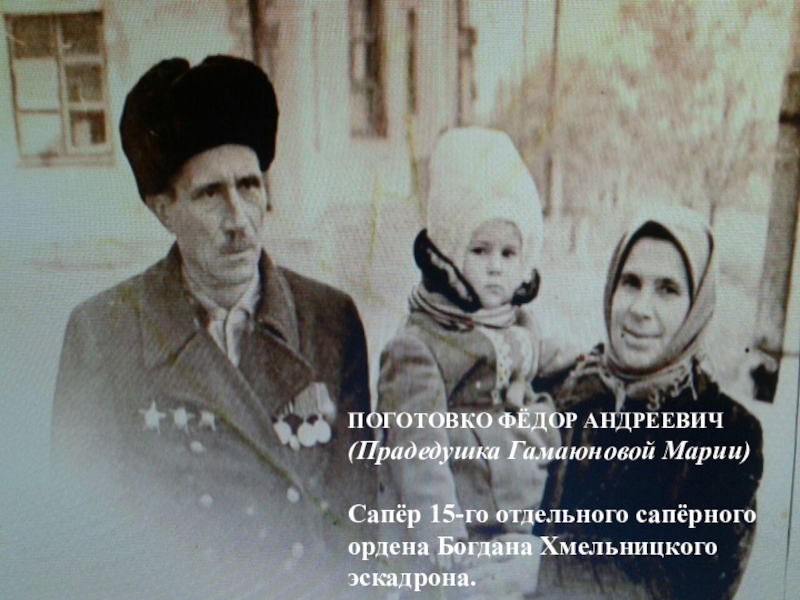 ПОГОТОВКО ФЁДОР АНДРЕЕВИЧ(Прадедушка Гамаюновой Марии)Сапёр 15-го отдельного сапёрного ордена Богдана Хмельницкого эскадрона.