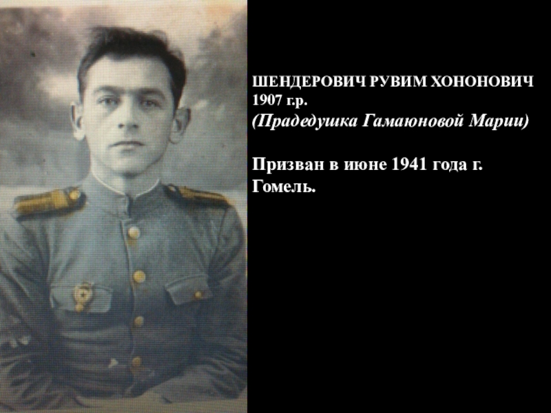 ШЕНДЕРОВИЧ РУВИМ ХОНОНОВИЧ 1907 г.р.(Прадедушка Гамаюновой Марии)Призван в июне 1941 года г. Гомель.