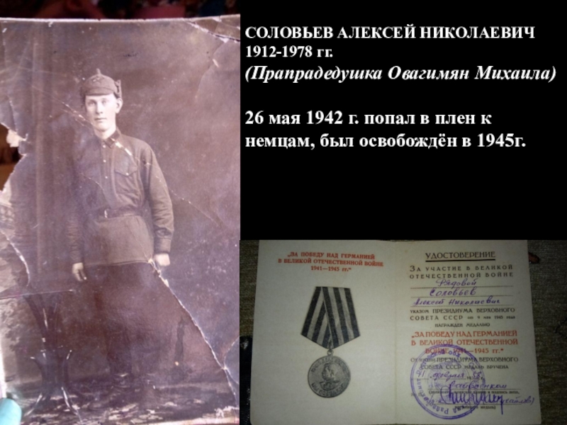 СОЛОВЬЕВ АЛЕКСЕЙ НИКОЛАЕВИЧ 1912-1978 гг.(Прапрадедушка Овагимян Михаила)26 мая 1942 г. попал в плен к немцам, был освобождён