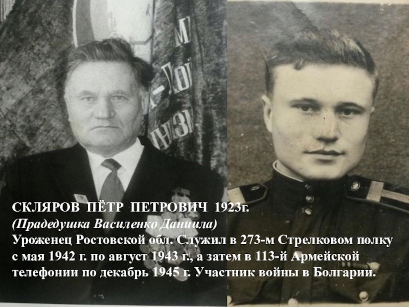СКЛЯРОВ ПЁТР ПЕТРОВИЧ 1923г.(Прадедушка Василенко Даниила)Уроженец Ростовской обл. Служил в 273-м Стрелковом полку с мая 1942 г.