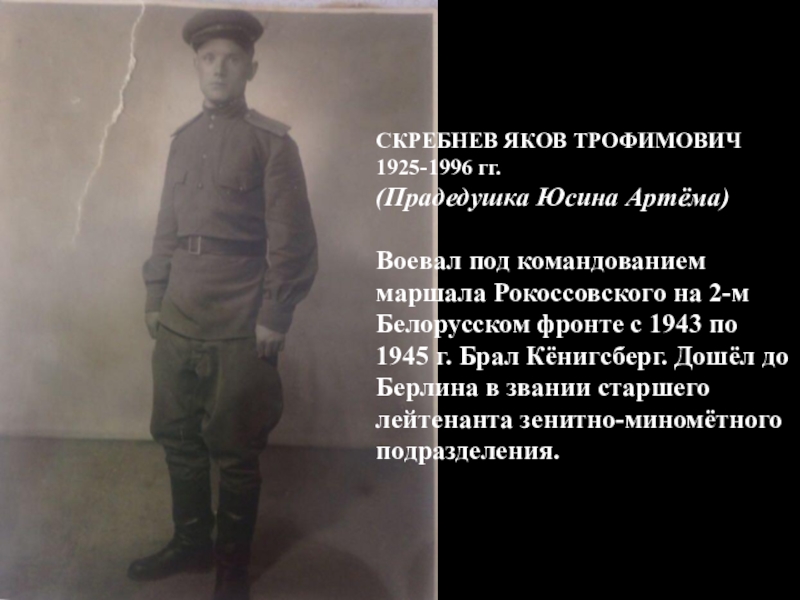 СКРЕБНЕВ ЯКОВ ТРОФИМОВИЧ 1925-1996 гг.(Прадедушка Юсина Артёма)Воевал под командованием маршала Рокоссовского на 2-м Белорусском фронте с 1943