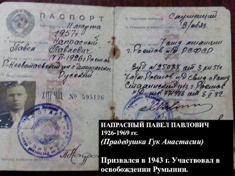 НАПРАСНЫЙ ПАВЕЛ ПАВЛОВИЧ 1926-1969 гг.(Прадедушка Гук Анастасии)Призвался в 1943 г. Участвовал в освобождении Румынии.
