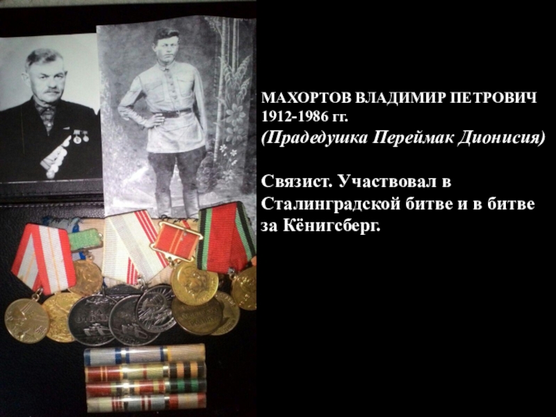 МАХОРТОВ ВЛАДИМИР ПЕТРОВИЧ 1912-1986 гг.(Прадедушка Переймак Дионисия)Связист. Участвовал в Сталинградской битве и в битве за Кёнигсберг.