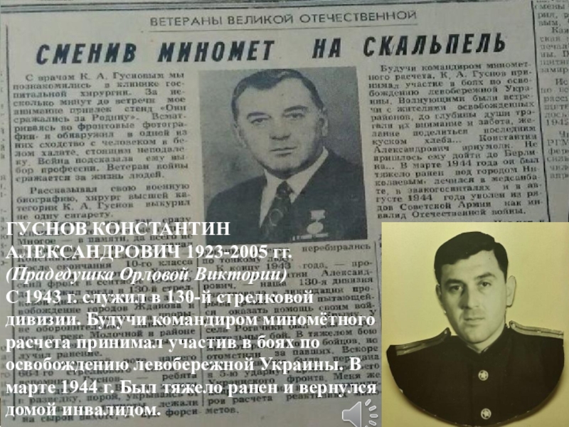 ГУСНОВ КОНСТАНТИН АЛЕКСАНДРОВИЧ 1923-2005 гг.(Прадедушка Орловой Виктории)С 1943 г. служил в 130-й стрелковой дивизии. Будучи командиром миномётного расчета принимал участив в боях по освобождению левобережной Украины. В марте 1944 г. Был тяжело ранен и вернулся домой