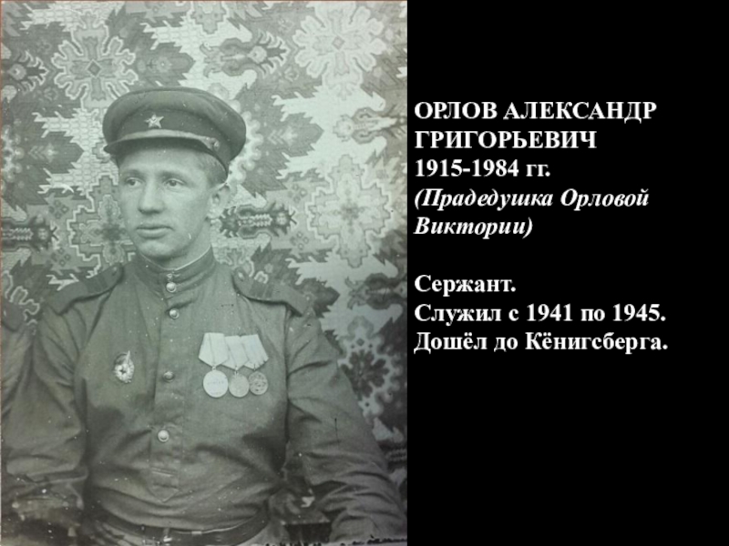 ОРЛОВ АЛЕКСАНДР ГРИГОРЬЕВИЧ 1915-1984 гг.(Прадедушка Орловой Виктории)Сержант. Служил с 1941 по 1945. Дошёл до Кёнигсберга.