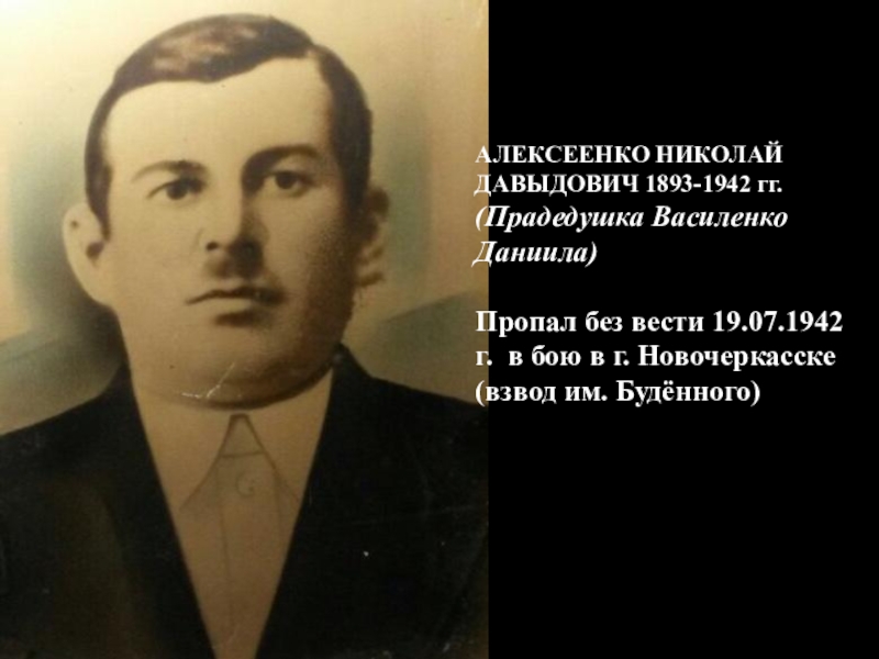 АЛЕКСЕЕНКО НИКОЛАЙ ДАВЫДОВИЧ 1893-1942 гг.(Прадедушка Василенко Даниила)Пропал без вести 19.07.1942 г. в бою в г. Новочеркасске (взвод
