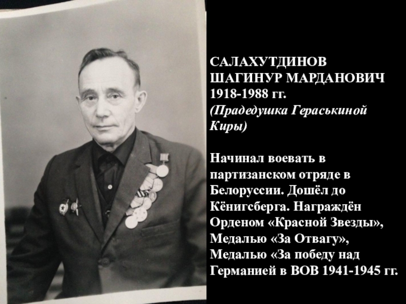 САЛАХУТДИНОВ ШАГИНУР МАРДАНОВИЧ 1918-1988 гг.(Прадедушка Гераськиной Киры)Начинал воевать в партизанском отряде в Белоруссии. Дошёл до Кёнигсберга. Награждён