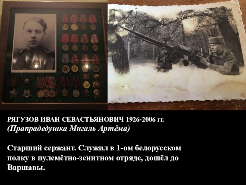 РЯГУЗОВ ИВАН СЕВАСТЬЯНОВИЧ 1926-2006 гг.(Прапрадедушка Мигаль Артёма)Старший сержант. Служил в 1-ом белорусском полку в пулемётно-зенитном отряде, дошёл