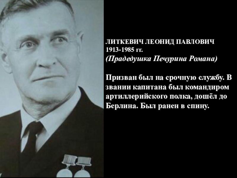 ЛИТКЕВИЧ ЛЕОНИД ПАВЛОВИЧ 1913-1985 гг.(Прадедушка Печурина Романа)Призван был на срочную службу. В звании капитана был командиром артиллерийского