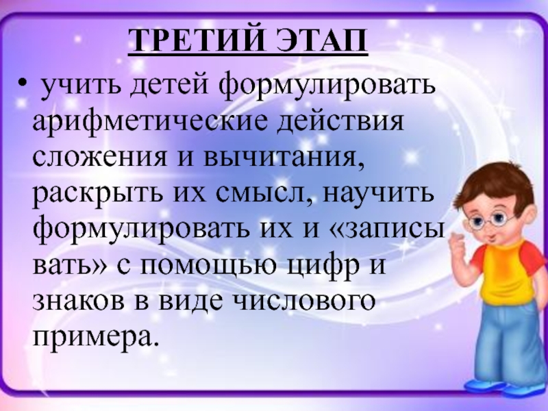 ТРЕТИЙ ЭТАП  учить детей формулировать арифметические действия сложения и вычитания, раскрыть их смысл, научить формулировать их