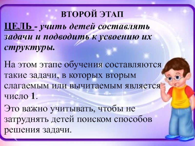 ВТОРОЙ ЭТАПЦЕЛЬ - учить детей составлять задачи и подводить к усвоению их структуры. На этом этапе обучения