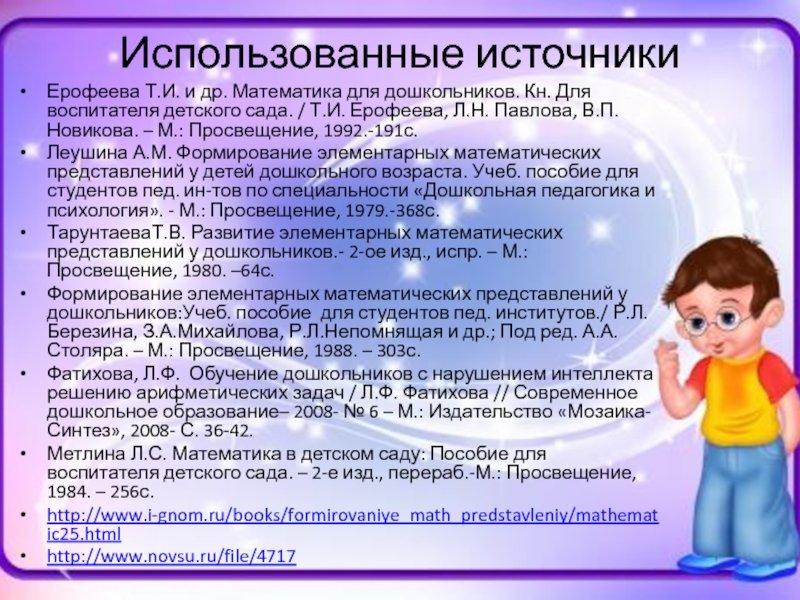 Использованные источникиЕрофеева Т.И. и др. Математика для дошкольников. Кн. Для воспитателя детского сада. / Т.И. Ерофеева, Л.Н.